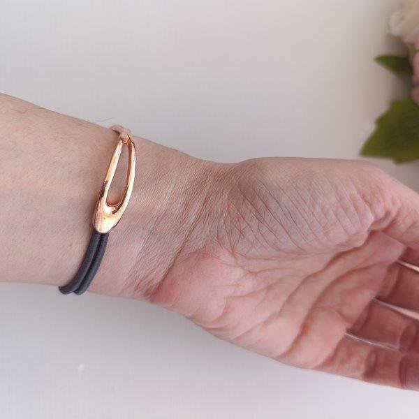 Designul original îmbină armonios două materiale: o jumătate realizată din metal rose gold lucios, cu formă elegantă de cui, iar cealaltă jumătate este realizată din elastic rezistent, oferind confort și flexibilitate la purtare.