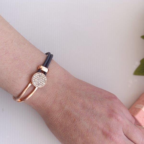 Capătul brățării este decorat cu un element rotund cu cristale strălucitoare, care reflectă lumina și oferă un efect discret de lux. Datorită elasticului, brățara se adaptează ușor pe încheietură și este potrivită pentru purtare zilnică.