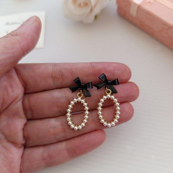 Completează-ți ținutele cu acești cercei eleganți cu fundiță neagră și detalii din perle fine, creați pentru a oferi un look sofisticat și feminin. Designul oval decorat cu perle adaugă un plus de rafinament, fiind alegerea ideală pentru un stil chic și modern.