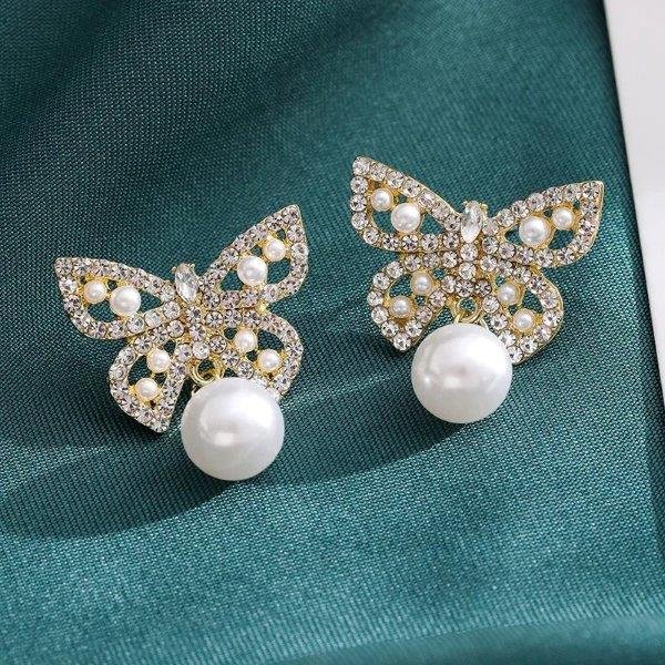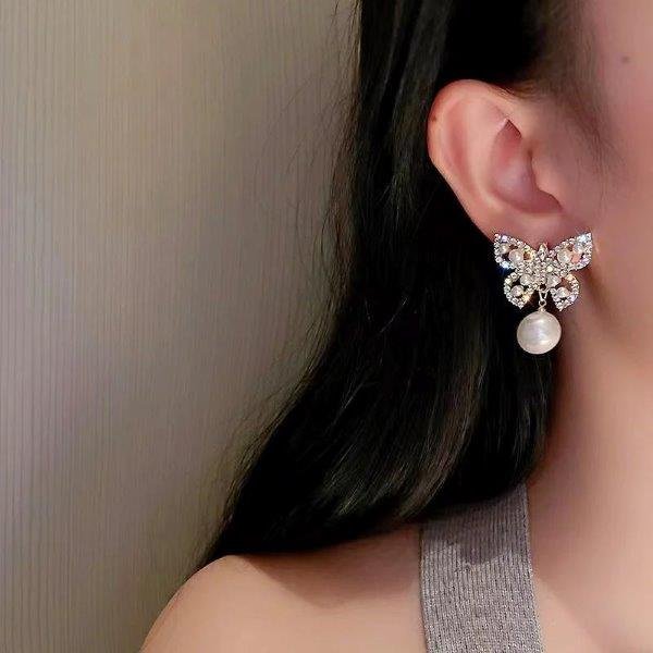 Fiecare fluture este decorat cu strasuri strălucitoare, iar în partea inferioară se află o perlă rotundă elegantă,