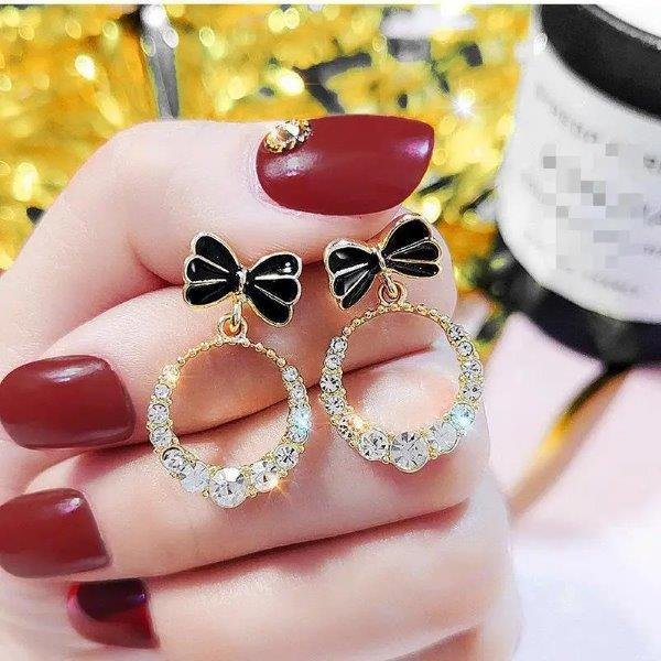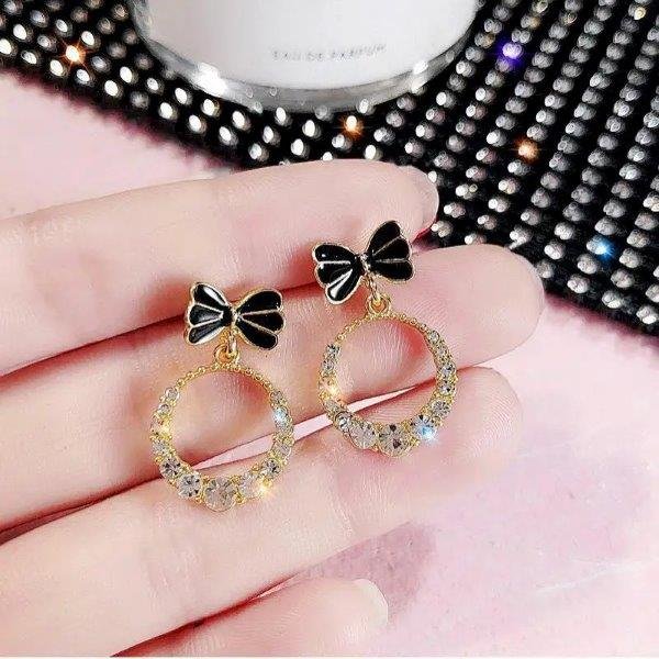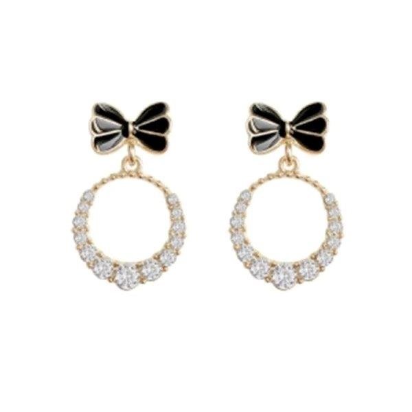 Alege un plus de eleganță cu acești cercei cu fundiță neagră și cerc cu cristale, un accesoriu feminin și sofisticat potrivit atât pentru ținutele de zi, cât și pentru cele de seară. Combinația de auriu, negru și strălucirea cristalelor oferă un efect rafinat și delicat.