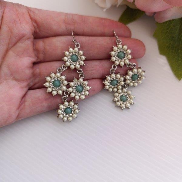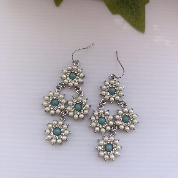 Acești cercei lungi eleganți impresionează printr-un design floral delicat, realizat din elemente decorative cu perlute albe și piatră turcoaz în centru. Modelul lor sofisticat este format din mai multe flori conectate armonios, creând un efect vizual rafinat și feminin.
