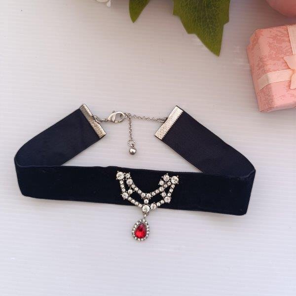 Acest colier choker elegant este un accesoriu rafinat care evidențiază linia gâtului și adaugă un plus de eleganță oricărei ținute. Realizat din catifea fină, colierul este decorat cu un element central strălucitor format din cristale transparente și un pandantiv roșu în formă de lacrimă, care oferă un contrast spectaculos.