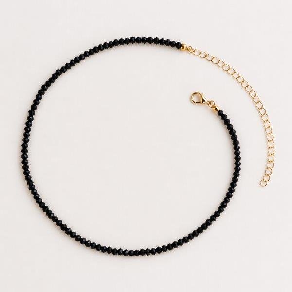 Colierul impresionează prin stilul său delicat, format din mărgele negre uniforme, completate de un sistem de închidere auriu și un lanț de extensie care permite ajustarea perfectă pe gât.